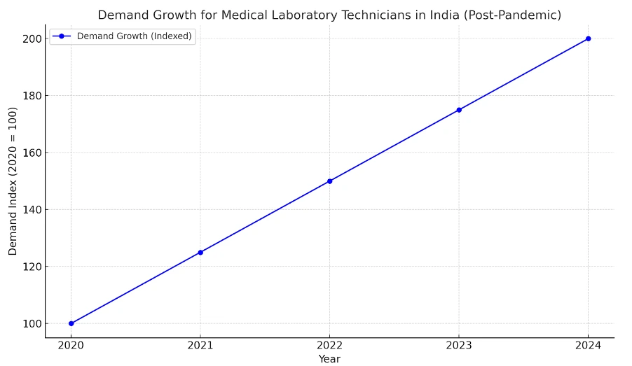 The graph above illustrates the indexed growth in demand for Medical Laboratory Technicians (MLTs) in India from 2020 to 2024. This trend is based on the increased need for diagnostic services and workforce expansions post-pandemic.