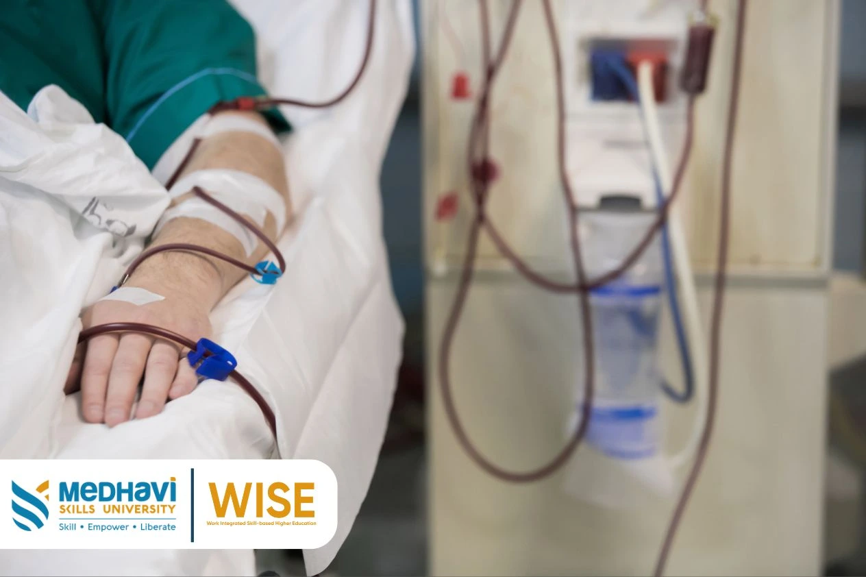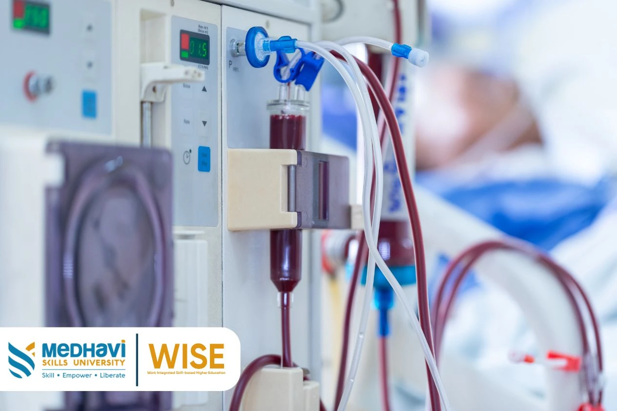 The easiest and the most accessible way to enter the field of dialysis technology is by pursuing a B.Sc. Dialysis Technology programme. It is usually a three year undergraduate programme that teaches the candidates the necessary knowledge, skills, and techniques required to perform their duties in the dialysis department. Skills based universities like Medhavi Skills University focus on skill-development and make sure that their curriculum blends both theory and practical skills making their students’ careers future-proof.