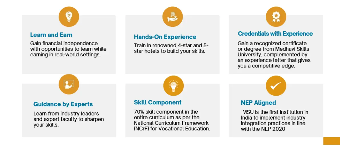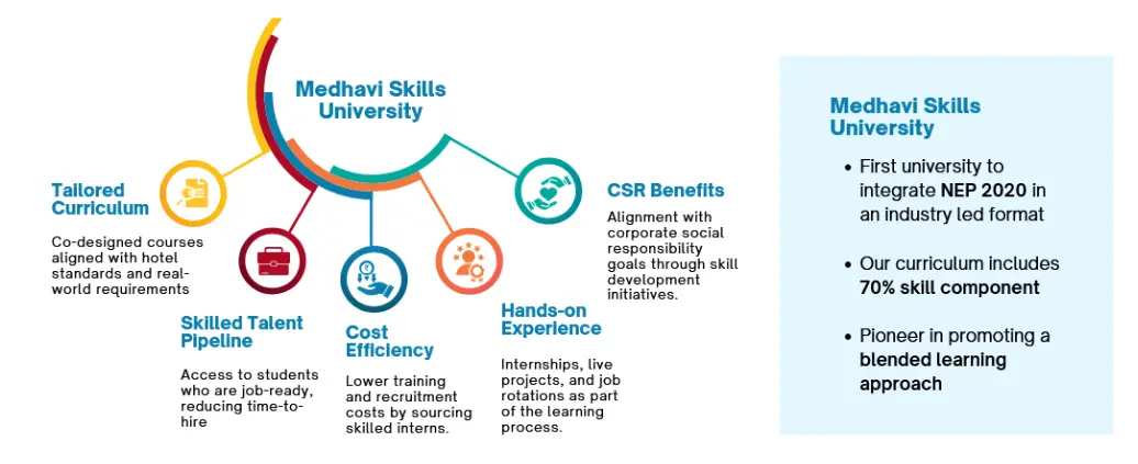 Medhavi Skills University’s WISE model is a catalyst in skill development in India. It integrates real-world experience and industry-aligned curriculum to bridge the gap between industry and academia. The WISE model aligns the cost-effective training goal with industry 4.0 market demand, leveraging industry-specialized programs. With 300+ industry partners, WISE is a game-changer in creating opportunities and strengthening the talent pipeline. Moreover, on-the-job training is a pivotal factor in revolutionizing education and empowerment. It can be said that WISE has set a benchmark to manage the educational expenses of students through OJT.