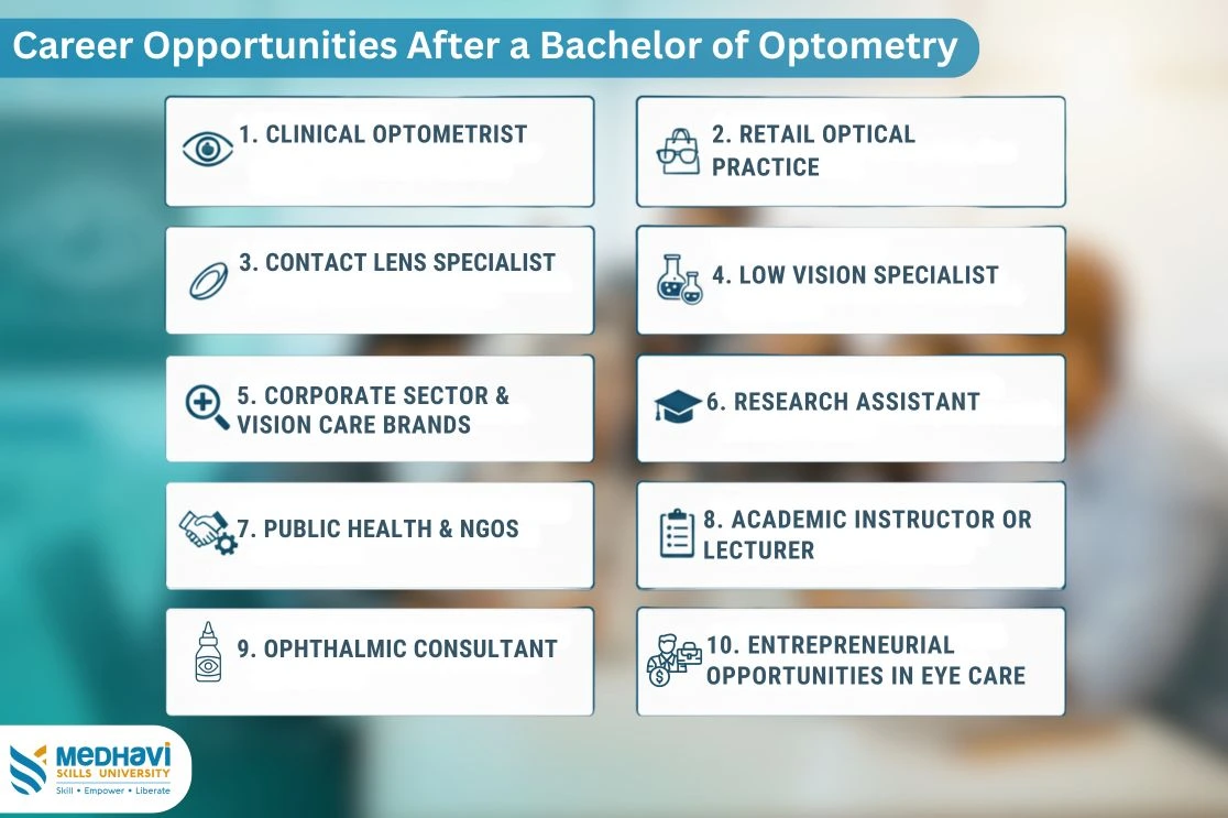 Eye health has become a rising priority across the globe due to increasing screen time, changing lifestyles, and increased awareness of visual care. This has led optometry to emerge as a respected and rewarding career. Graduates with a Bachelor of Optometry degree or B.Sc Optometry have achieved a considerable level of knowledge surrounding vision care, eye disorders, and modern approaches to diagnosis. This knowledge, skill, and experience can open opportunities in various settings including healthcare, research, clinical practice, and entrepreneurship.