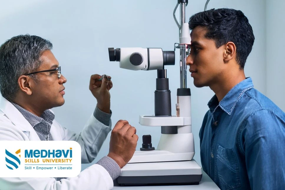 Medhavi Skills University is unique because it provides a work-integrated, skill-based education experience in alignment with NEP 2020. Students experience up to 70% practical exposure during OJT - at leading eye-care hospitals. The program affords students learning experience before graduating, ready to work on day one.