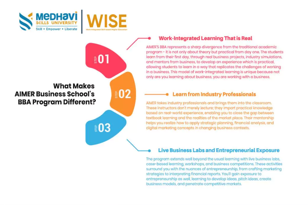 AIMER Business School's BBA in Business Management, in partnership with Medhavi, is unique because this is a new type of program that is industry-engaged and focused. Below are a few reasons why the program is a transformative experience:
