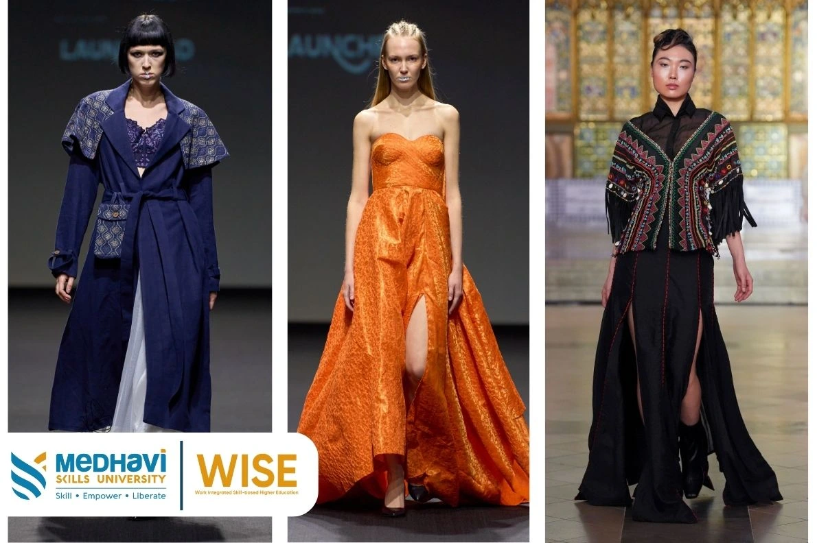Students of the B.Voc in Interior Design and Fashion Design at Medhavi Skills University, in collaboration with NIF Global, have showcased their original creations on prestigious global runways including New York, London, Dubai, and Lakme Fashion Weeks. These platforms reflect their creative excellence, global exposure, and industry-ready design skills.